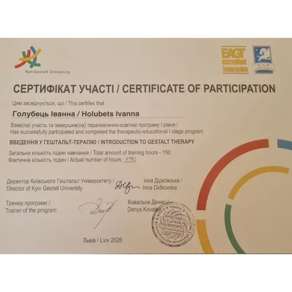 Я працюю глибоко й уважно: не пришвидшую процес і не знецінюю біль, а допомагаю зрозуміти, про що він і які сили ховаються під ним. Маю досвід роботи з кризовими станами, втратами, переживанням війни, тривогою та питаннями самоцінності; поєдную структурність позитивної психотерапії, гештальт-підхід і використовую метафоричні асоціативні карти.