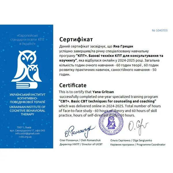 Дипломований психолог, сертифікована в методі когнітивно-поведінкової терапії низької інтенсивності. Якщо вам складно знайти відповіді на важливі питання, впоратися зі стресом або емоційними труднощами, я готова допомогти. Разом ми знайдемо рішення, які зроблять ваше життя легшим і щасливішим.