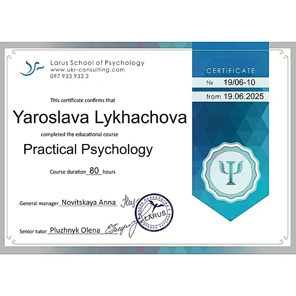 Я психолог-консультант, мама 2 дітей. Допомагаю людям краще розуміти себе, свої емоції та будувати гармонійні стосунки з оточенням, знаходити опору. Моє завдання — створити для вас безпечний простір, де ви зможете говорити відверто, бути собою та знаходити рішення, які працюють саме для вас.